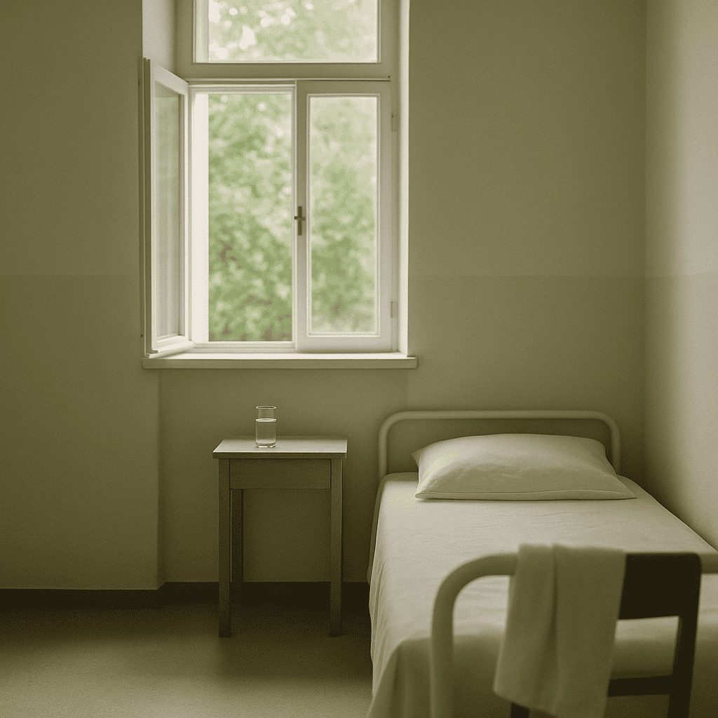 “documentary interior photo of a sanatorium room in morning light; glass of water on bedside table; folded towel over chair back; open window to soft green trees; minimal, calm; square composition; realistic color; subtle grain; 35mm, f/4 — no hospital equipment, no blue tint, no CGI.”